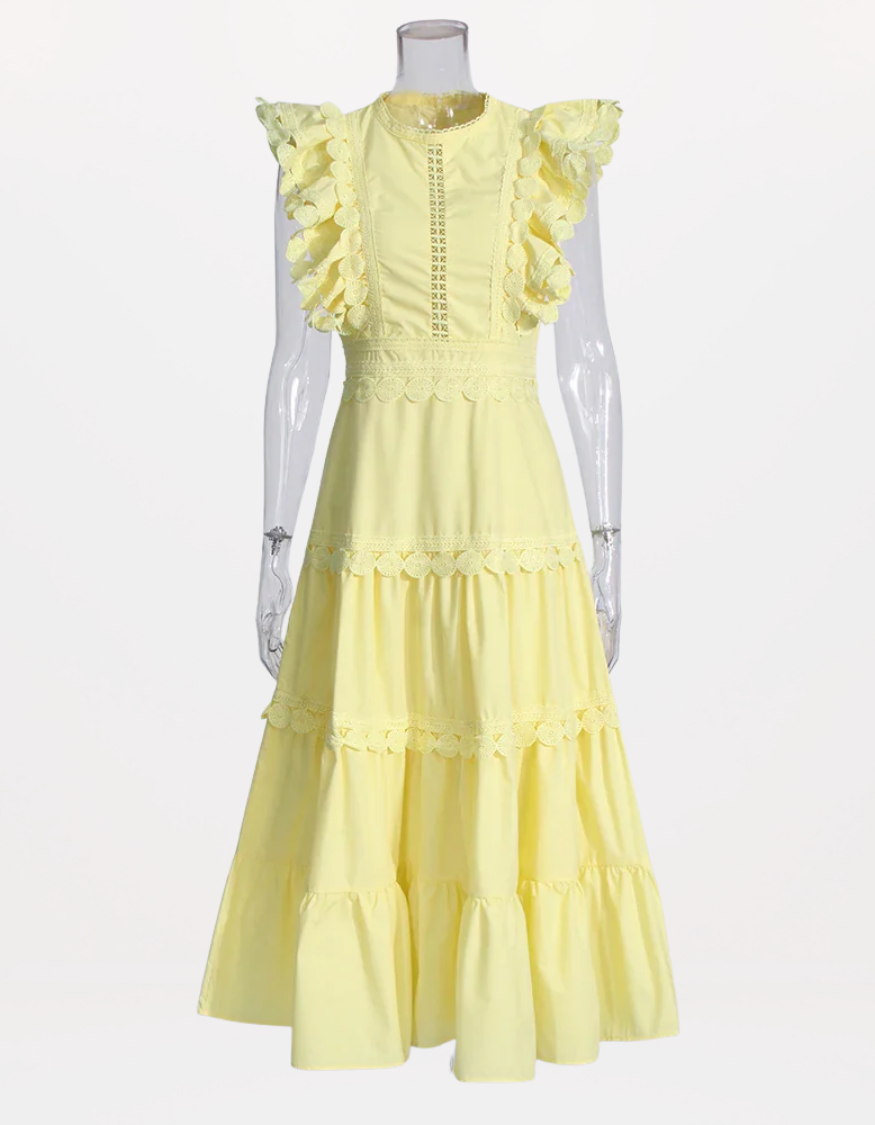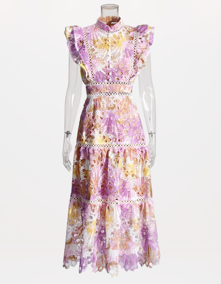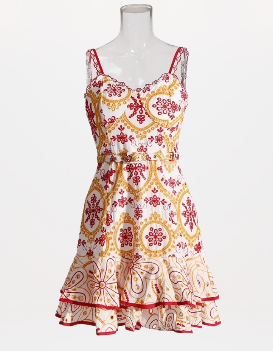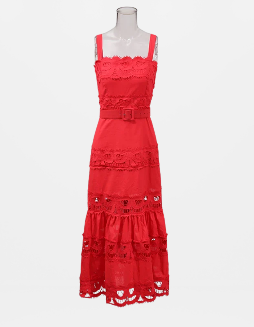 Red Richelieu Embroidered Maxi Dress – Sleeveless High Neck A-Line Silhouette