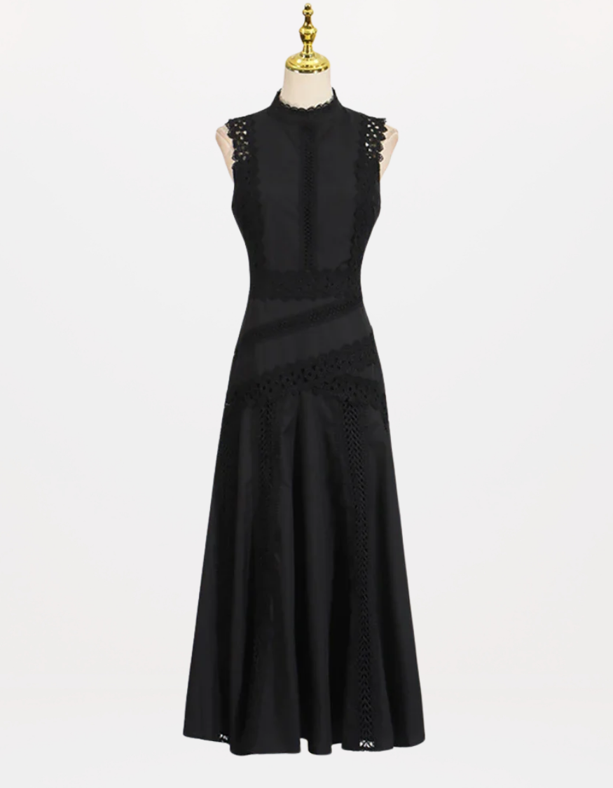 Elegant Patchwork Sleeveless Dress Lapel & Lace-Up Detail Temperament Chic